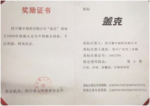 公司高度重视品牌战略,依法注册了“盖克”、“蜀中”、“三星堆”、“阿莫锋”、“益善源”、“蓉通”、“mk体育app官网下载入口”等108件注册商标,1999年“盖克”、2003年“蜀中”、2007年“三星堆”被认定为德阳市知名商标,2001年“盖克”、2004年“蜀中”被认定为四川省著名商标, 2008年“盖克”商标被国家工商行政管理总局认定为“中国驰名商标”。2017年3月,公司盖克牌、mk体育app官网下载入口牌阿莫西林胶囊和多酶片被四川省人民政府授予四川名牌产品称号。2016年,公司实现营业收入66373万元,利税7600万元;2017年,公司实现营业收入75045万元,利税7572万元。公司2017年被命名为德阳市第七批院士专家工作站,2016-2018连续三年被德阳市人民政府确定为重点龙头企业。